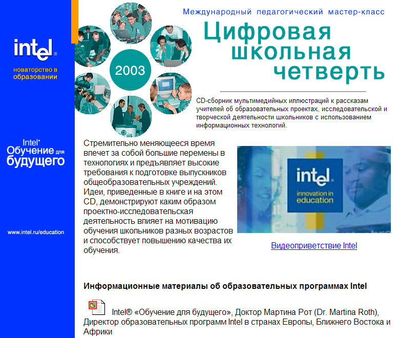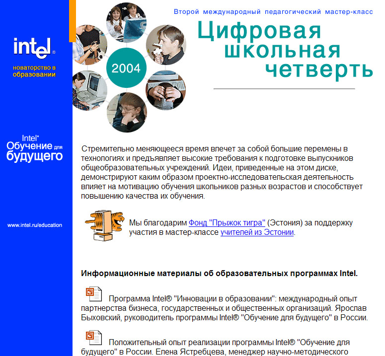 2004 г. (октябрь) - верстка электронного приложения (CD-сборник мультимедийных иллюстраций) к книге "Цифровая школьная четверть" (2004) для Программы Intel® "Обучение для будущего" в России.