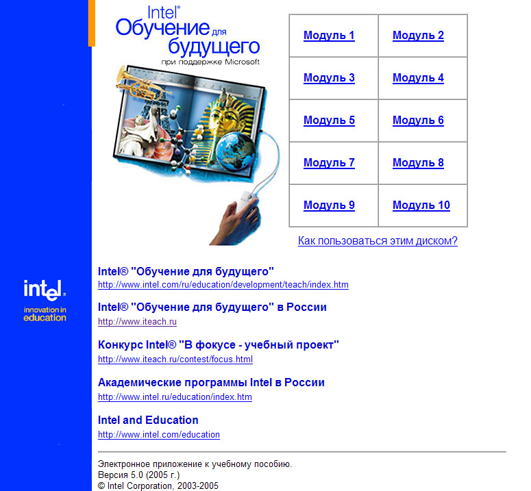 2005 г. (январь) - верстка электронного приложения (CD версия 5.0) к переизданию учебника Программы Intel® "Обучение для будущего" в России.